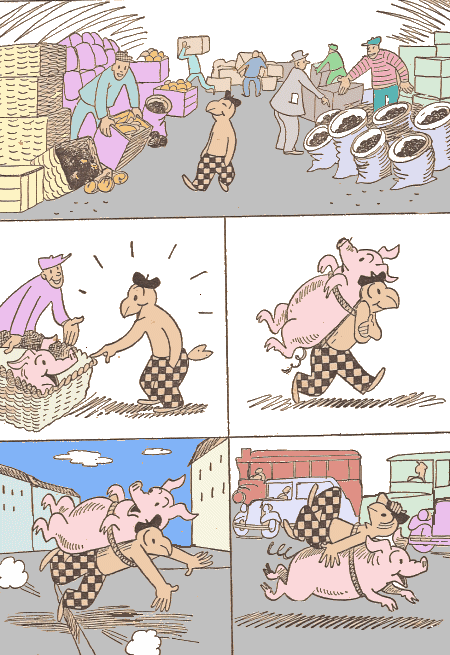 As Hales são as primeiras, Têm de tudo em quantidade. Carnes, salsichas, presuntos, Pela manhã. os caminhões Globi comprou no mercado Transportava o animalão