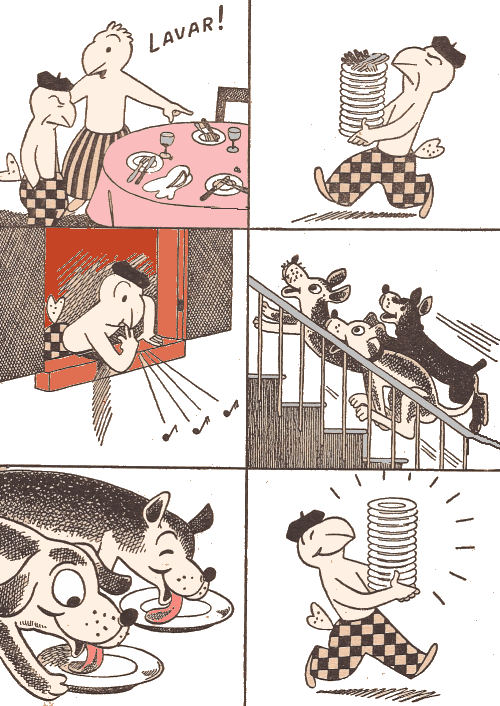 assobiando. Os animais atenderam e os pratos todos