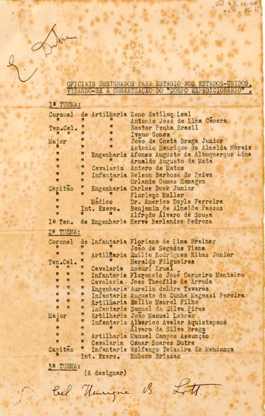 "A tarefa para selecionar os soldados da FEB foi árdua, sobretudo porque grande parte do contingente vinha dos meios rurais, sem os conhecimentos mínimos para entrar de imediato em cursos especializados ou treinamentos com os equipamentos que seriam colocados à disposição da tropa, com o agravante de que a quase totalidade dos equipamentos bélicos, dos portáteis aos leves, dos de transmissão aos pesados, havia sido adquirida na Europa antes da guerra, apresentando portanto, características totalmente diversas dos congêneres americanos. " "A FEB