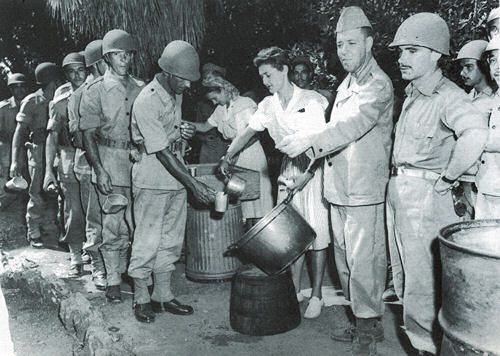 Mulheres da Cruz vermelha servem soldados brasileiros, recém