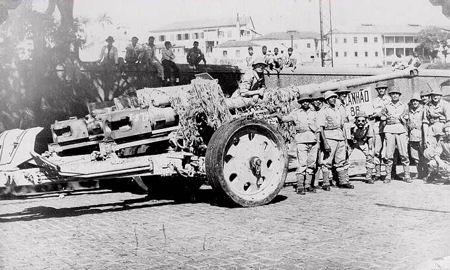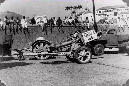 68ª Pergunta: Ficou o Brasil com algum material apreendido? Resposta: Apenas alguns exemplares dos canhões alemães foram trazidos para o Brasil e hoje se encontram no Museu do Exército e ornamentando o Parque da Academia Militar das Agulhas Negras e de algumas Unidades do Exército. O Brasil nada quis, não exigiu nenhuma indenização de guerra e os poucos bens dos súditos alemães e italianos que haviam sido confiscados, quando da declaração de guerra aos seus países, foram posteriormente a eles devolvidos. O idealismo e altruísmo brasileiros atingiram o auge quando, não satisfeitos com a contribuição do seu generoso sangue, indenizaram aos Estados Unidos da América do Norte todo o material fornecido à FEB, inclusive a munição gasta nas operações de guerra e os gêneros alimentícios por eles fornecidos. "100 Vezes