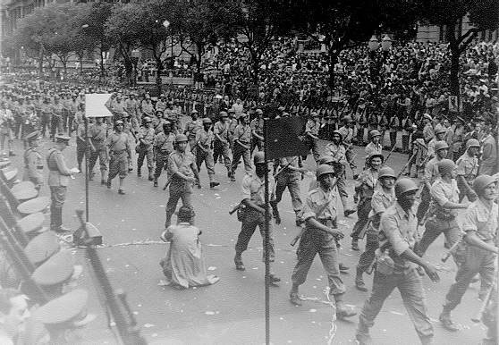 As ruas junto ao cais estão impedidas pela Polícia Especial. Os ferrabrazes de carabina às costas afastam o povo que procura entrar em contato com os recém-chegados. Estes também levam alguns empurrões. João Afonso olha as boinas vermelhas e os braços fortes dos policiais e lembra-se de um comício dissolvido, cena que presenciara por acaso, pouco antes da implantação do Estado Novo. "São os mesmos!" - pensa. "Será possível? Houve guerra, sangue, destruição, um mundo que desabou, e aí estão os mesmos polícias de boina vermelha, com as suas brutalidades. Como isto não combina com o nosso estado de ânimo! Estivemos na guerra, vimos tanto sangue, sentimos o cheiro dos cadáveres, mas agora o que nós queremos é um pouco de relaxamento, é o ritmo suave da vida brasileira, com que sonhamos na Itália." Mais alguns populares conseguem infiltrar-se através do cordão de isolamento. Continua-se também conversando com os moradores das casas compreendidas no novo campo de concentração. Aparecem molecotes maltrapilhos que pedem cigarros americanos. Imaginem só, parece Nápoles! E o casario feio do porto lembra tantos outros que ficaram para trás. Tendo a sensibilidade aguçada pelos meses de provação, os soldados parecem notar agora aspectos do seu próprio pais que antes passavam geralmente despercebidos. Não, não, não é isto que eu quero ver, esta é a minha terra, e eu quero gozá-la em sua plenitude. Basta olhar a orla dos morros, não o pedaço da favela que aparece com o seu casario, mas os outros morros com a sua vegetação, este sim é o meu pais, a terra com que eu sonhei sobre a neve e que não esperava mais rever. Finalmente, vem a ordem de marcha. Apanham-se os fuzis ou as carabinas, e uma longa formação de semifantoches, semitrapos, tontos de emoção, quase cegados pelo sol carioca encaminha-se para a Avenida Rio Branco. Os raios de sol batem em cheio sobre o asfalto, sobre os rostos e os capacetes de cortiça, penetram como um hino triunfal, como uma saudação de boas-vindas, no intimo de cada um. Impossível desfilar em formação. A multidão cercava os soldados, abraçava-os, beijava-os, arrancava-lhes os distintivos metálicos. O soldadinho magro e de bigode ralo, que é de um lugarejo bem distante, que não está acostumado às efusões do carioca, que passou meses transido de frio e de medo em buracos cavados na terra e na neve dos Apeninos, fica tonto, deslocado, os olhos marejados. Há uma diferença profunda entre o conceito que ele tem de si e a imagem que dele fazem os homens do povo. Afinal, o que foi que eu fiz? Estive em terra estranha; quando me diziam para atirar, atirei; quando me ordenavam recuar, obedeci também, senti frio, medo, solidão, e foi só. O homem sente-se pequeno e mesquinho, e os compatriotas fazem dele um herói, quase uma figura de lenda. Mas, apesar de heróis, o que mais querem os soldados é abraçar uma pessoa da família, um amigo, a namorada. Investigam ansiosamente os rostos ao redor, olham para as sacadas repletas de gente e para as arquibancadas na avenida. Tudo inútil! E o jeito mesmo é entregar-se passivamente ao entusiasmo da multidão. A infantaria não conseguiu desfilar em formação. Os soldados eram carregados nos braços, em meio a vivas, buzinas de automóveis tocando e compassos marciais. Depois da infantaria, entrou na avenida uma comprida coluna motorizada. Os jipes e caminhões eram igualmente assaltados. Ficava-se com os braços doloridos de tantos puxões. "Meu Deus! Meu Deus! Será que encontrarei todos vivos lá em casa?" - pensa um cabinho magricela, que deixou o pai com câncer da garganta. Pirulito tenta dizer algumas piadas. Mas não adianta, a molecagem não consegue disfarçar a emoção. O sargento Anésio sonda inutilmente a multidão, à procura da mulher e dos filhos. Alípio está zonzo, não consegue raciocinar, manter a frieza, a serenidade com que procura ultimamente orientar toda a sua conduta. Sim, na guerra, o jeito era armar-se de pachorra, deixar correr o barco, revestir-se, na medida do possível, de uma carapaça feita de conformismo e moleza. Mas o regresso ao mundo dos civis exige outro preparo interior, uma nova agudez de percepções, maior flexibilidade e velocidade de reação. Tudo isto requer grande autodomínio. Mas aí na avenida, não. Sou um homem histórico, um monumento ambulante, não preciso pensar, não devo até! João Afonso olha também para as arquibancadas. E aquela multidão exultante, de milhares de rostos, transforma- se num único semblante, de olhos estranhos e desconhecidos, mas tão amigos, de uma simpatia tão irradiante. É isso mesmo, isso mesmo, vem cá, morena, não precisa arrancar-me pedaços do uniforme, aí vai um retratinho meu. Não se assuste com a cara, foi no inverno, em Porretta Terme. Ciao! "Guerra em